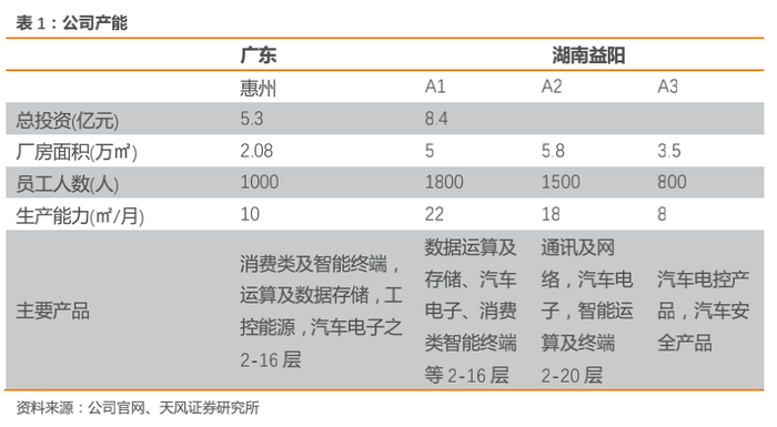 产能:公司目前主要有广东惠州,湖南益阳A1/A2/A3工厂,根据公司官网,4个工厂合计产能为58万平方米/月,合计总投资为13.7亿元,合计员工人数为5100人。不同工厂所承接的产品类型和产品层数不同,导致各厂间asp、稼动率、盈利能力有所差异。