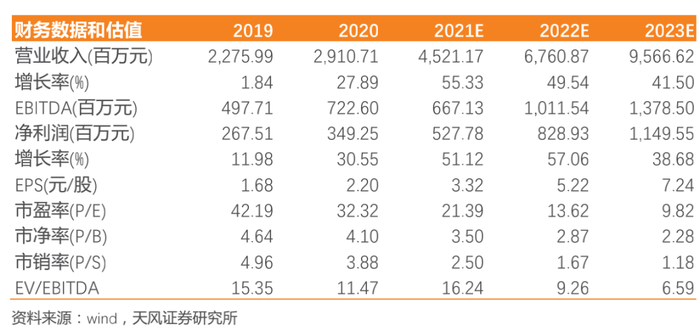 4.投资建议:根据公司产能释放节奏,预期公司21-22年营收为45.21/67.61亿元,yoy+55.33%/49.54%,净利润5.28/8.29亿元,yoy+51.12%/57.06%,综合考虑公司业绩增速、估值中枢、可比公司估值,给与公司20-25xPE估值,对应2021年目标价格为66.4-83元/股,首次覆盖,给予“买入”评级