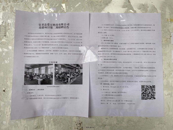 在陕西宜君、清涧、贵州铜仁走访时,我们看到街头的电线杆、县政府前的广场屏幕上,打着招人工智能训练师、云客服、假发工艺师(这是假发全球电商产业链的一个环节)的招聘广告。