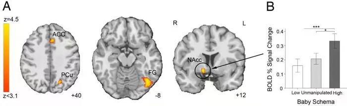 当我们看到成人和婴儿的脸时,主要的视觉区域就会被激活,比如梭状回面孔区(大脑后部一个用来识别面孔的区域)。