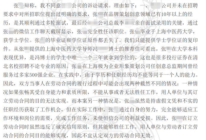 综上,张某认为,尽管其存在虚构学历及工作经历的事实,但通过自己的努力能够胜任自身的职位,也得到了公司领导及同事的认可,公司的主张无法律依据,故请求法院驳回公司的损失。