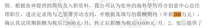 根据张某提供的信息,该公司认为其海外学历符合创意中心总经理职位,遂决定录用与之签署劳动合同,并根据其填写的薪酬期待(年薪200万元),确认其试用期薪酬为税后72800元/月,转正后薪酬为税后91000元/月,远高于公司其他同级别管理者。