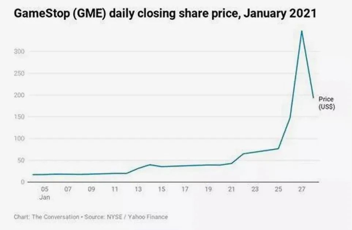 这天之前,大量美股散户抱团,大规模买入一家线下游戏公司Gamestop(游戏驿站,GME)的股票,硬生生地把GME这支股价在2020年长期低于10美元的“垃圾股”,拉高到最高483美元/股。