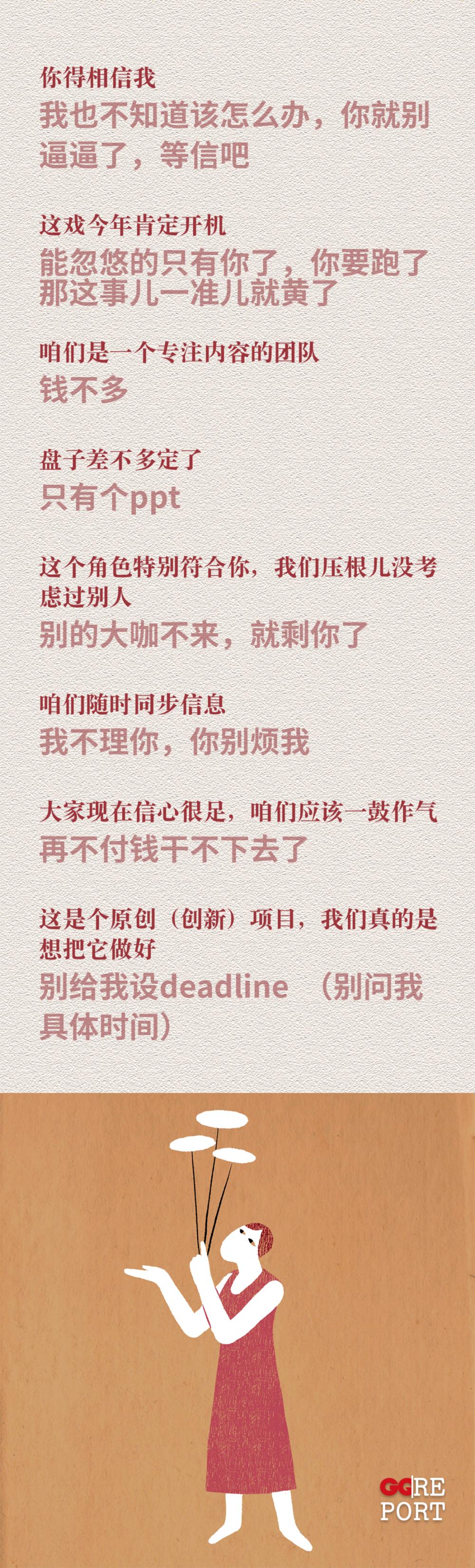 制片人:喂?哎!您好您好,咱这戏今年肯定开。咱们这也是个原创项目,我们也是一直在精雕细琢。毕竟我们也是一个专注内容的团队,而且这个角色也和你特别贴,我们压根儿没考虑过别人。现在大盘子基本上定了,刚跟资方沟通过,大家现在信心很足,得一鼓作气干下去。这个你得相信我,咱们随时保持联系吧。