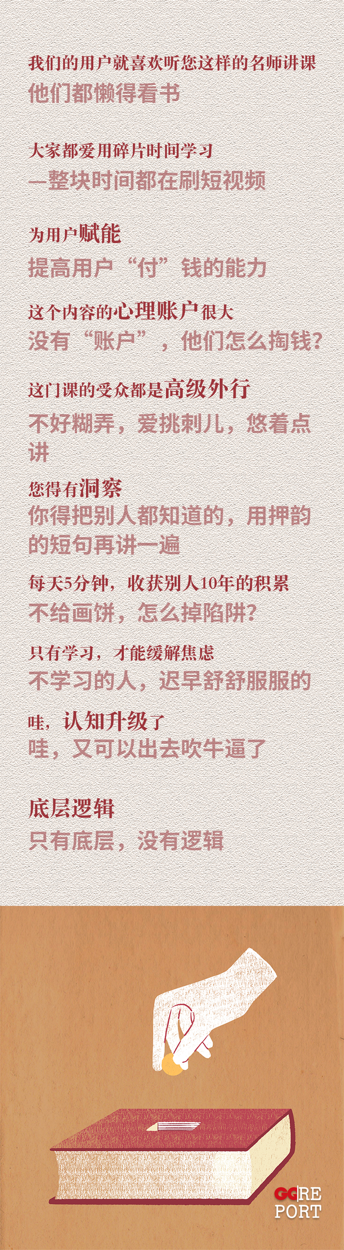 老师,咱们的课件还是得仔细磨一磨。咱们公开课的底层逻辑在于,先分批植入个人价值的外化(老师是个大牛),打高学生的期待,然后进行学生痛点的挖需(告诉学生你哪儿不行),最好进行场景复现的演绎(你平时如何如何不行),目的是告诉学生“你有病,老师懂你”。然后导入学科知识及方法,告诉学生“我有药,能治病”。