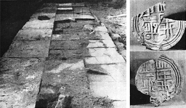 遗址内的砖石走道和“万岁”瓦当(广州市文管处等:《广州秦汉造船工场遗址试掘》)