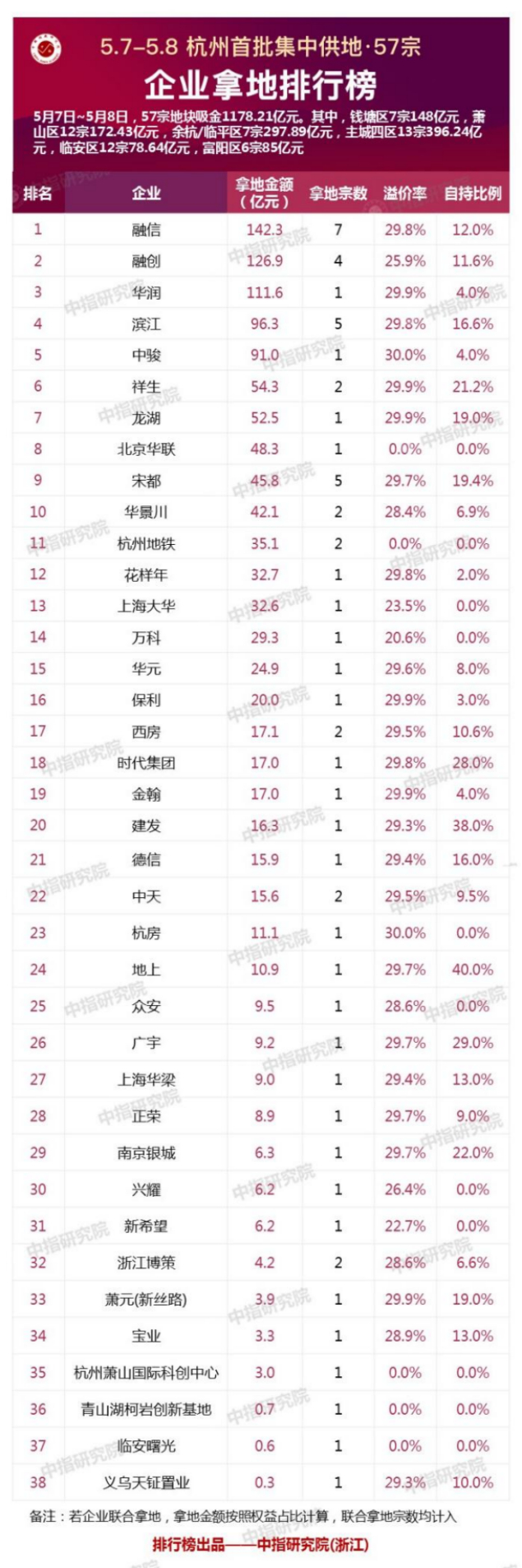 本次竞拍,57宗地块中,共38家企业有所斩获。本次拿地金额最大、拿地宗数最多的房企是融信,分别拿下西湖1宗、上城2宗、萧山4宗,共7宗地块,合计建筑面积78.6万㎡,总金额达142.3亿元。融创本次拿地金额为126.9亿元,位于第二,拿地宗数4宗。华润虽仅竞得未来科技城三站换乘综合体项目地块,但仍以111.6亿元拿地金额位列第三。