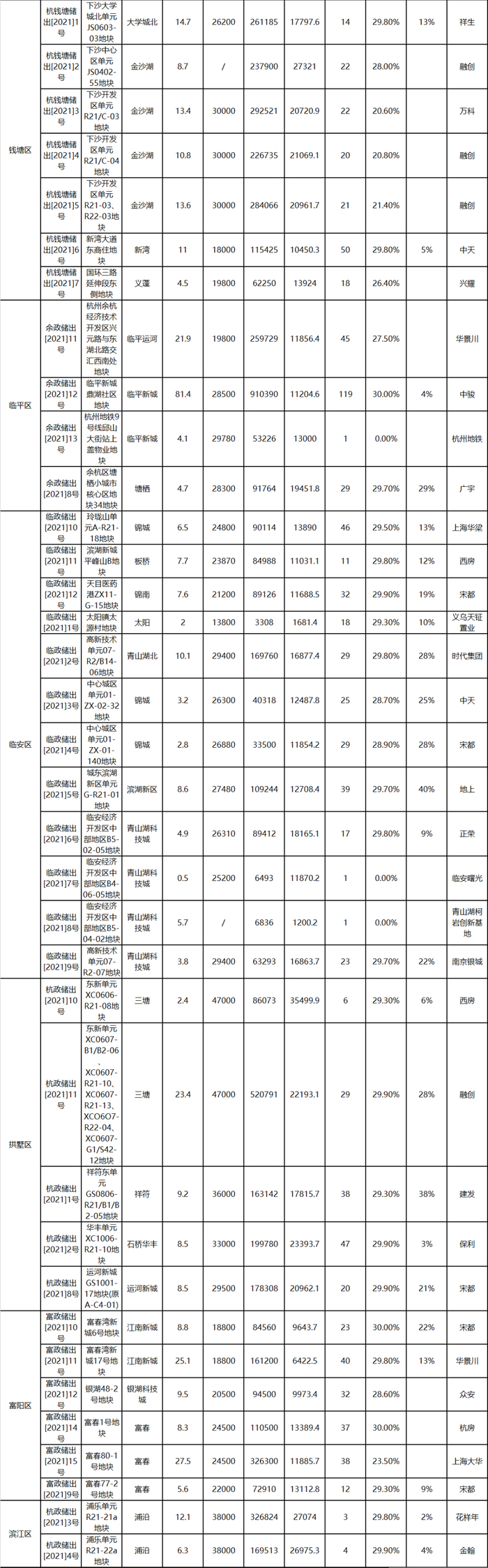 第三:机会难得。虽说2021年有三次供应,但是根据公告1个月的规则,12月公告的第三批地块大概率是明年1月份组织竞拍。如此今年就剩两次拍地的机会,第二批的供应面积仅占32.9%。所以为了增加土储,关注杭州市场的房企也不会放弃这次机会。