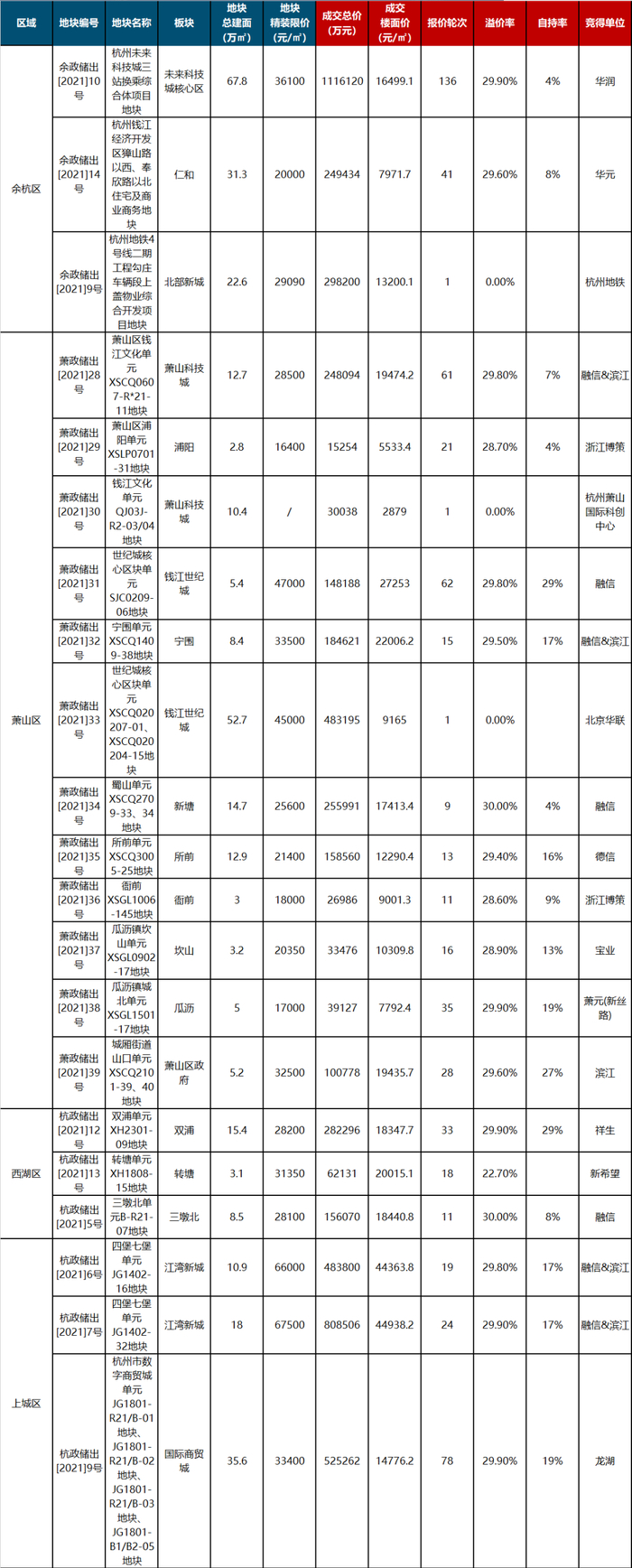 本次集中供地整体上各区域地块都比较热门,除6宗底价成交的地块外,所有的地块溢价率都在20%以上。但相对其他区域,富阳区与钱塘区市场表现较为理性,16宗未竞自持的地块中,钱塘新区有5宗,富阳区有3宗。