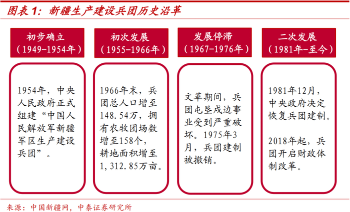 新疆生产建设兵团是新疆历史沿革的独特产物。新疆生产建设兵团为屯垦戍边而生,承担着发展生产、维护稳定、保卫边疆的使命,其发展主要经历以下四个阶段[1]: