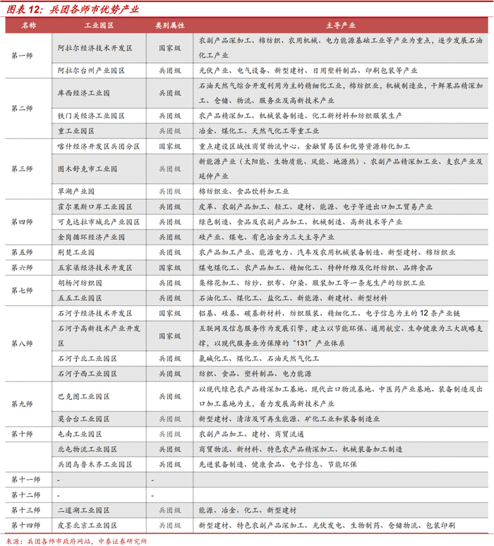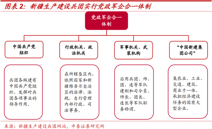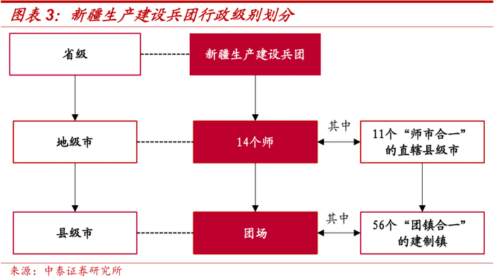 新疆生产建设兵团介绍:新疆生产建设兵团实行党政军企合一体制,承担“劳武结合、屯垦戍边”的历史使命,受中央政府和新疆维吾尔自治区双重领导,享有省级权限。截至2021年3月末,兵团下设11个“师市合一”的直辖县级市和3个师,56个“团(场)镇合一”的建制镇和93个普通团场。中央及新疆维吾尔自治区人民政府相继颁布了多个文件,从产业发展、财税补贴、体制改革、融资渠道等多方面促进新疆及兵团发展。