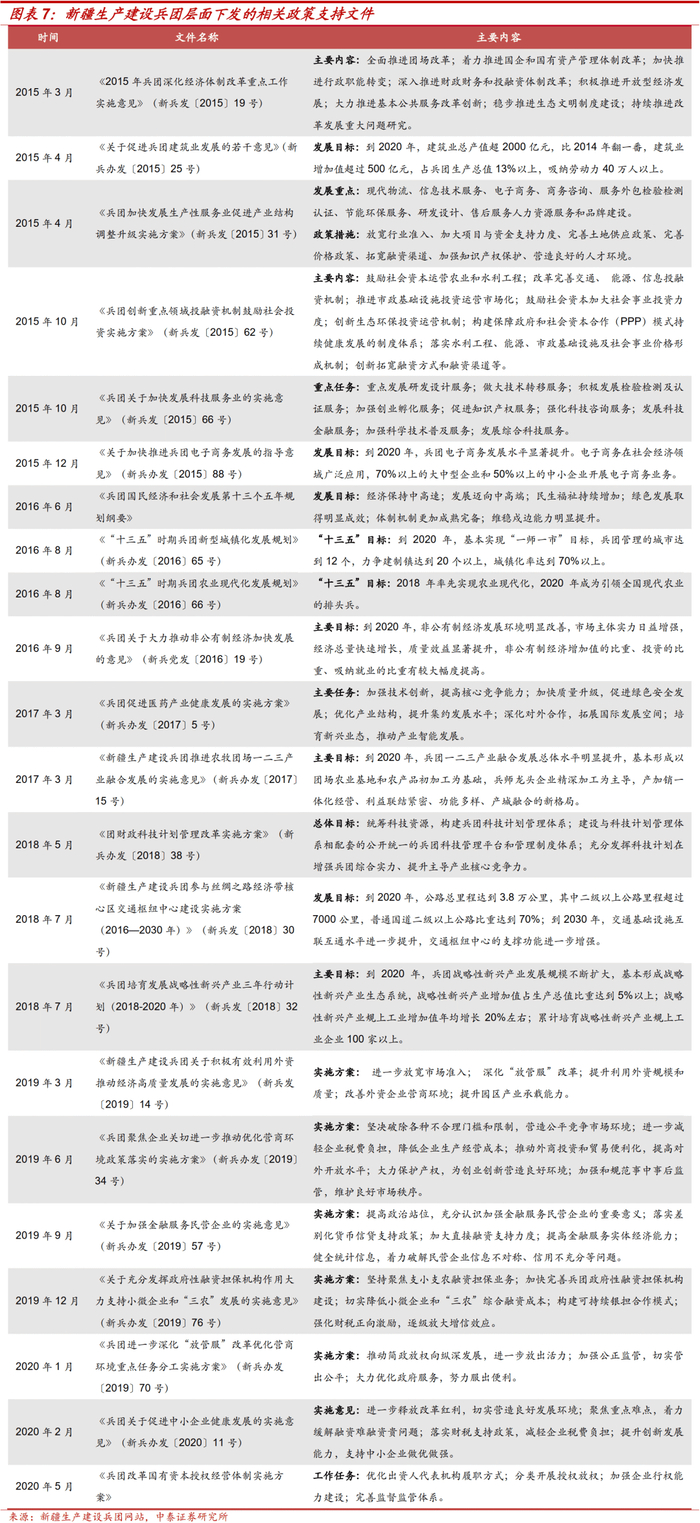 因新疆维吾尔自治区及新疆生产建设兵团的特殊性,中央及各部委、新疆维吾尔自治区人民政府相继颁布了多个文件,从产业发展、财税补贴、体制改革、融资渠道等多方面对新疆及兵团给予支持,充分反映了政府对其发展的重视。