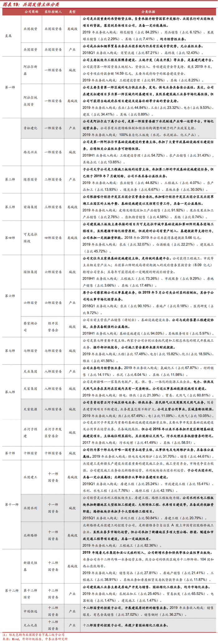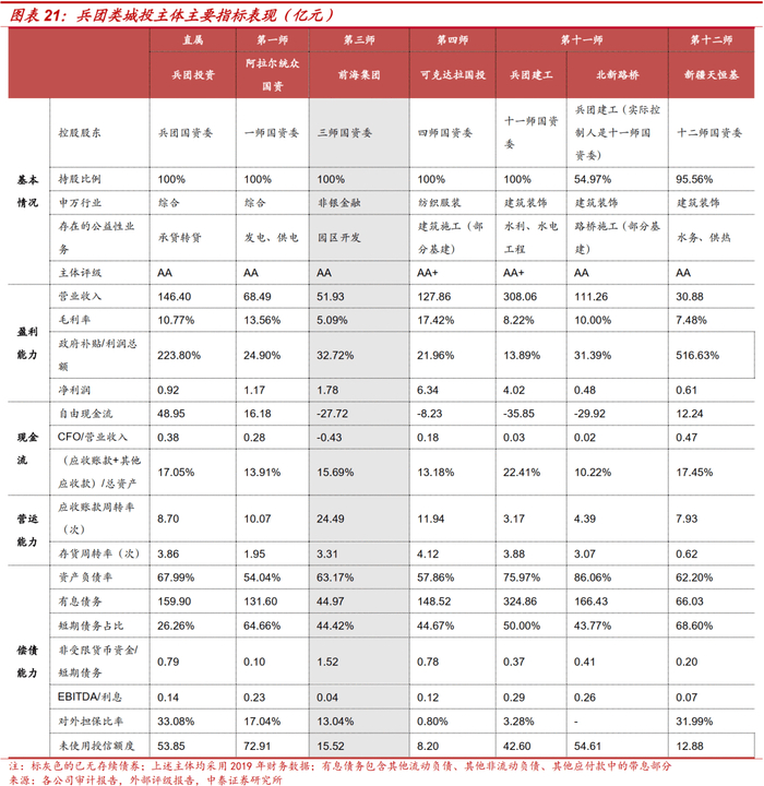兵团投资2019 年主营业务收入主要来自棉花销售(占比84.25%)、药品销售(占比6.12%)、果蔬罐头(占比2.29%)业务,并不涉及典型的城投业务。但公司是兵团重要的承贷转贷平台,由公司承接并转贷国开行、兵团农行对兵团相关项目的贷款,并落实到具体项目公司。