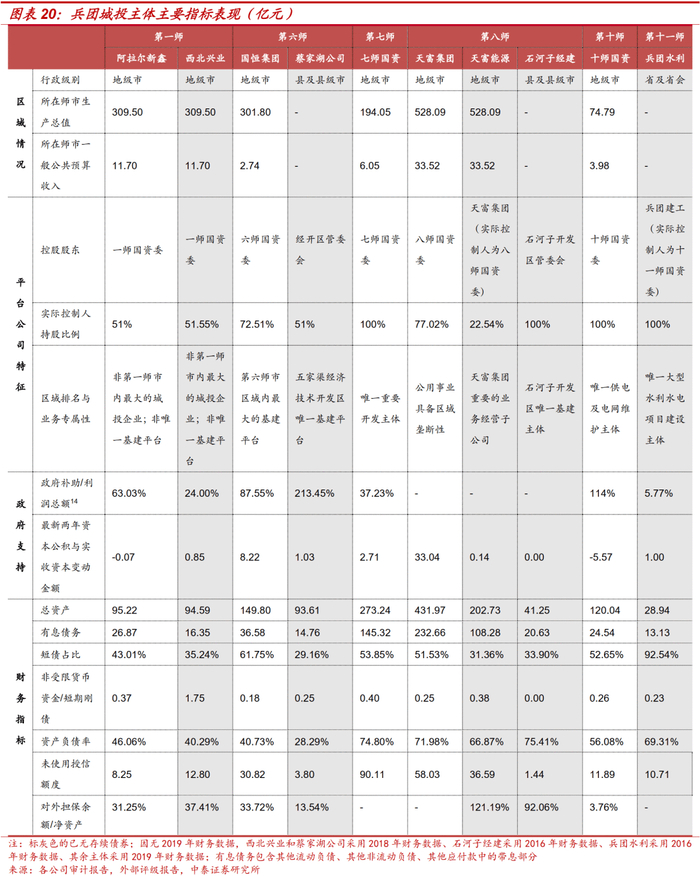 对于此类城投企业来说,我们认为应该侧重于分析地方政府对城投企业提供支持的能力和意愿,而简化对平台企业的基本面分析。公司在区域内的主体地位、政府支持能力与政府支持意愿在投资决策中起着更加重要的作用,我们选取以下指标对10家兵团城投主体进行梳理。