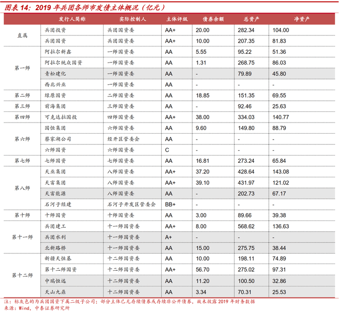 截至2021年4月25日(下同),兵团国资委直属2家发债主体、14个师中有23家实际控制人为各师市兵团国资委的主体发过债,其中17家发债主体仍有存续债券,存量债券余额共计303.67亿元。最高外部主体评级为AA+;2019年末发债主体总资产规模均不超过600亿元。