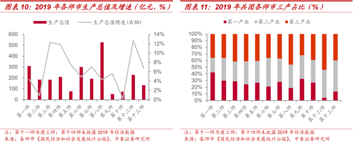 兵团区域经济、财政概况:新疆生产建设兵团经济发展持续向好,产业结构不断优化,是新疆维吾尔自治区经济社会发展的重要力量。但兵团整体经济、财政实力相对较弱,且各师市之间分化显著。从经济实力看,兵团发展以第一、第二产业为主;第八师石河子市经济总量遥遥领先。从财政角度看,2018年起,随着财政体制改革不断推进,兵团开始拥有独立财权。上级补助是各师市平衡财政收支的重要手段。