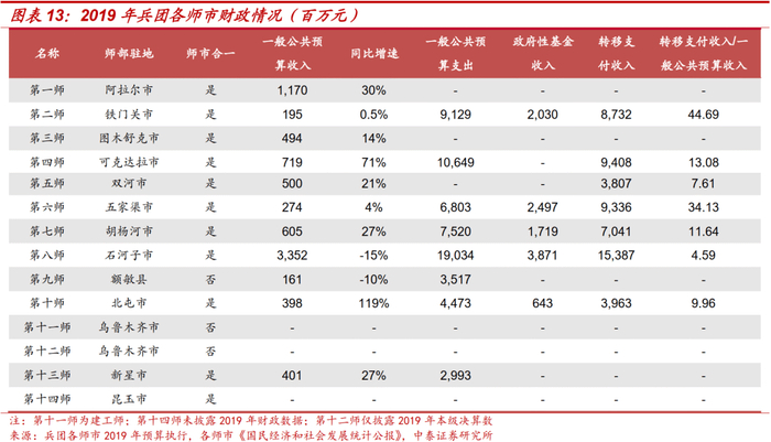 兵团已正式实施财政管理体制。兵团明确了兵团、师、团场3级财政事权和支出责任,同时参照地方编制财政预算,提前通知师、团年度转移支付补助额度。从下面各师市看,第八师石河子市财政实力在各师市中处于相对较好水平,2019年实现一般公共预算收入33.52亿元;第一师阿拉尔市实现一般公共预算收入11.70亿元,位居第二;其余各师市实现一般公共预算收入规模均不足10亿元,其中最低的第九师仅实现一般公共预算收入1.61亿元。从披露转移支付收入的师市看,上级补助是各师市平衡财政收支的重要手段。
