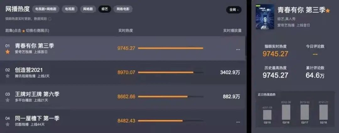 对于视频网站来说,无法拒绝选秀综艺带来的流量。数据显示,第一季的《偶像练习生》在播出短短三个月时间,总播放量就达到了28.3亿次,单期播放超2.3亿次,同名微博话题阅读量达到134.9亿,相关微博话题盘踞微博热搜榜高达577次。今年选秀的热度虽不及第一届,但依旧能打——据猫眼专业版的全网热度显示,2月17日《青春有你3》以9519.62的全网热度值居于当日所有综艺节目的首位,《创造营2021》的全网热度值则为8674.79,排在第三位。