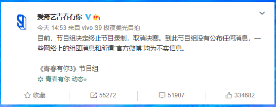 5月9日下午,爱奇艺青春有你官微发文称,“目前,节目组决定终止节目录制,取消决赛。”至此,《青春有你3》彻底宣告终结。粉丝一边抱怨没有等到训练生们的毕业典礼,一边缅怀《偶像练习生》直播夜超过20个微博热搜的盛况。