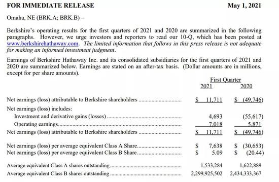 根据当时伯克希尔哈撒韦发布一季度财报显示,2021年第一季度营收645.99亿美元,前值为612.65亿美元,预期为635.39亿美元。公司当季运营利润70.2亿美元,较去年同期增长20%,比疫情暴发前、也就是2019年的55.6亿美元高出了26%以上。