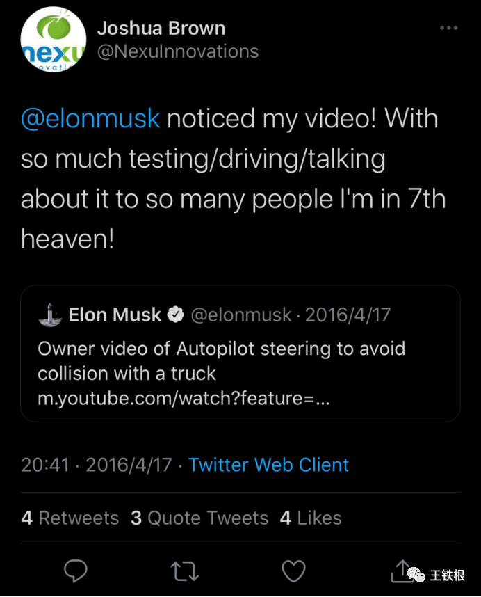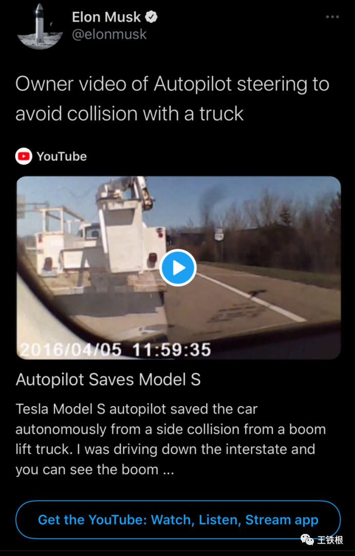 我不记得特斯拉有努力引导车主正确使用车辆或者公开纠正过这些行为,相反,马斯克还很得意地转发过许多车主无干预仅靠车辆自己去处理一些紧急情况的视频,其中就包括一位狂热的特斯拉车主在高速公路上放松接管,任由车辆自行躲避大卡车的视频: