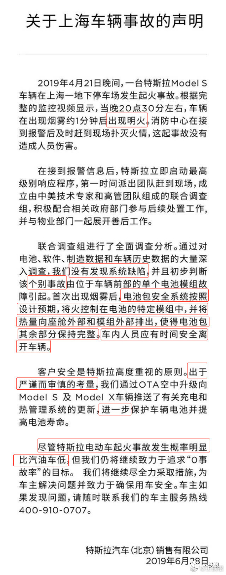 特斯拉自燃后,一份令人大跌眼镜的声明