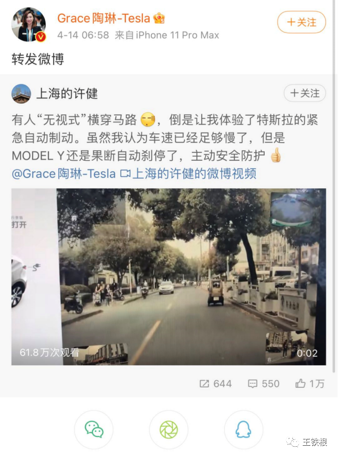 特斯拉粉丝车主看到行人横穿马路,故意不踩刹车等车子自己刹停。这种公然的危险驾驶行为,被特斯拉全球副总裁陶琳当作特斯拉技术水平高的证据得意转发。