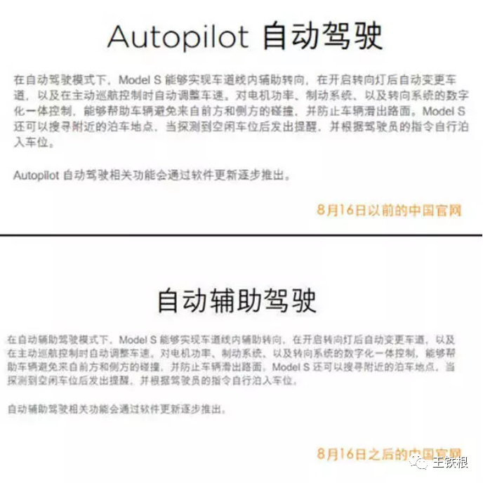 我一直对“自动辅助驾驶”这个名字非常不满。我们理解的“自动驾驶”就是“无人驾驶”,“辅助驾驶”就是“有人驾驶”。那“自动辅助驾驶”是什么呢?无人有人驾驶?如果我们把“自动辅助驾驶”里的“自动”二字删掉,它的意思并没有任何改变,都是“需要人随时干预的辅助驾驶”。所以为什么一定要加上“自动”二字,我想和特斯拉对功能命名的小心思有关:加上“自动”显得更高级,更科技一些。
