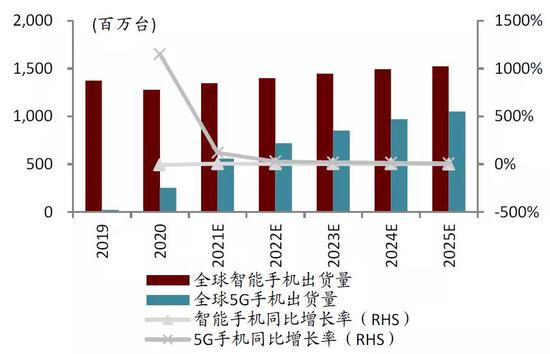 图表:2019-2025E全球智能手机&5G手机