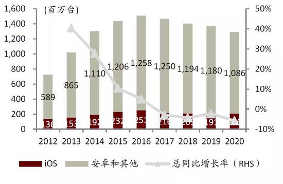图表:2012-2020年全球智能手机销量