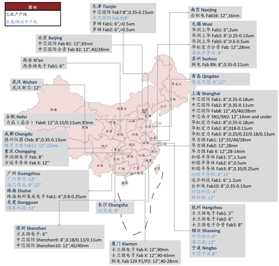 图表:中国大陆主要晶圆厂分布情况(不含存储器产线)