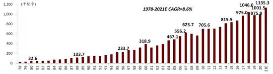 图表:1978-2020年全球芯片出货量