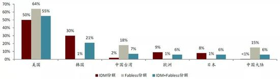 图表:2020年全球部分国家/地区IDM、Fabless、IDM+Fabless市场份额