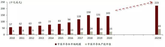 根据IC Insights,2020年中国大陆集成电路公司在芯片设计(Fabless)领域占全球份额15%,由于IDM在全球的份额低于1%,中国大陆的IC产品产出(即IDM+Fabless产值)仅占全球份额的5%。另一方面,自2005年以来中国大陆就一直是全球最大的IC市场,IC Insights测算2020年中国大陆的IC市场规模为1434亿美元,IC Insights预测2025年市场规模将达到2230亿美元。