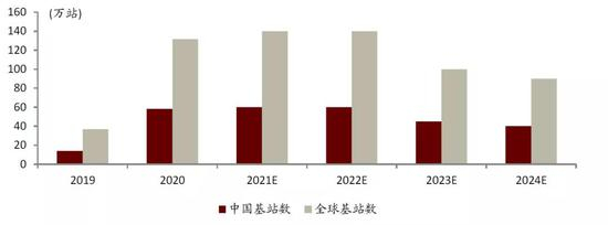 图表:2019-2024E中国及全球基站 每年建设数量