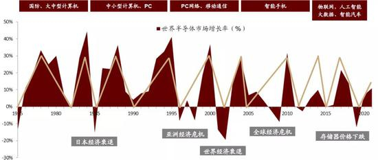 图表:1975-2020年全球半导体市场增长率的周期性变化