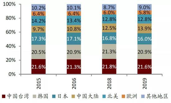 图表:2015-2019年全球晶圆产能分布(按地区拆分)