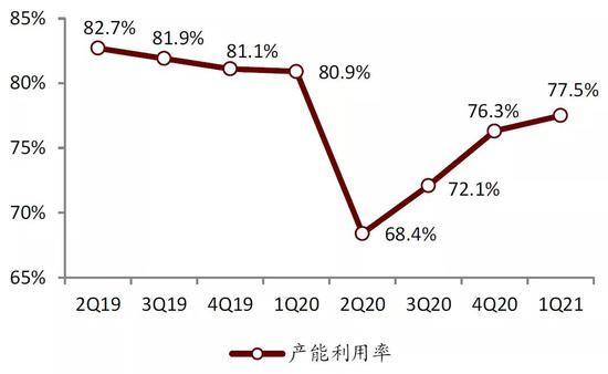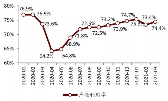 欧美地区半导体产能受疫情影响较大,当前处于产能恢复阶段。美欧是全球重要的半导体产品输出国,也是全球受疫情影响较为严重的区域。我们看到,2020年2月,美国半导体厂商的产能利用率约77%,3月份受疫情影响开始下滑,4月份达到最低为64%,之后产能利用率开始爬升。截至今年3月份,产能利用率最高到75%左右,仍未达到疫情前77%左右的产能利用率。欧洲受到的影响不逊于美国,欧洲制造业的产能利用率在2020年Q1及之前在81%以上,Q2受疫情影响下降到68.4%,今年Q1仅恢复到77.5%,亦未达到疫情前的水平。