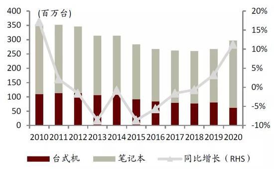 图表:2010-2020年全球个人电脑出货量