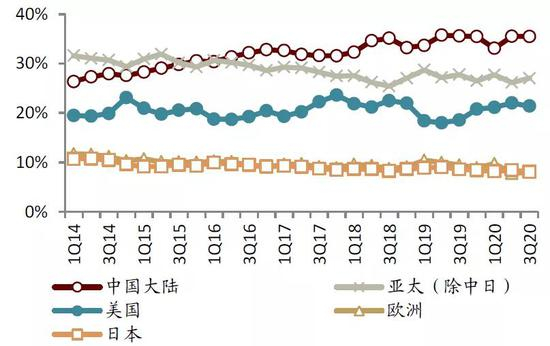 图表:1Q14-4Q20全球各国家/地区半导体销售额占比