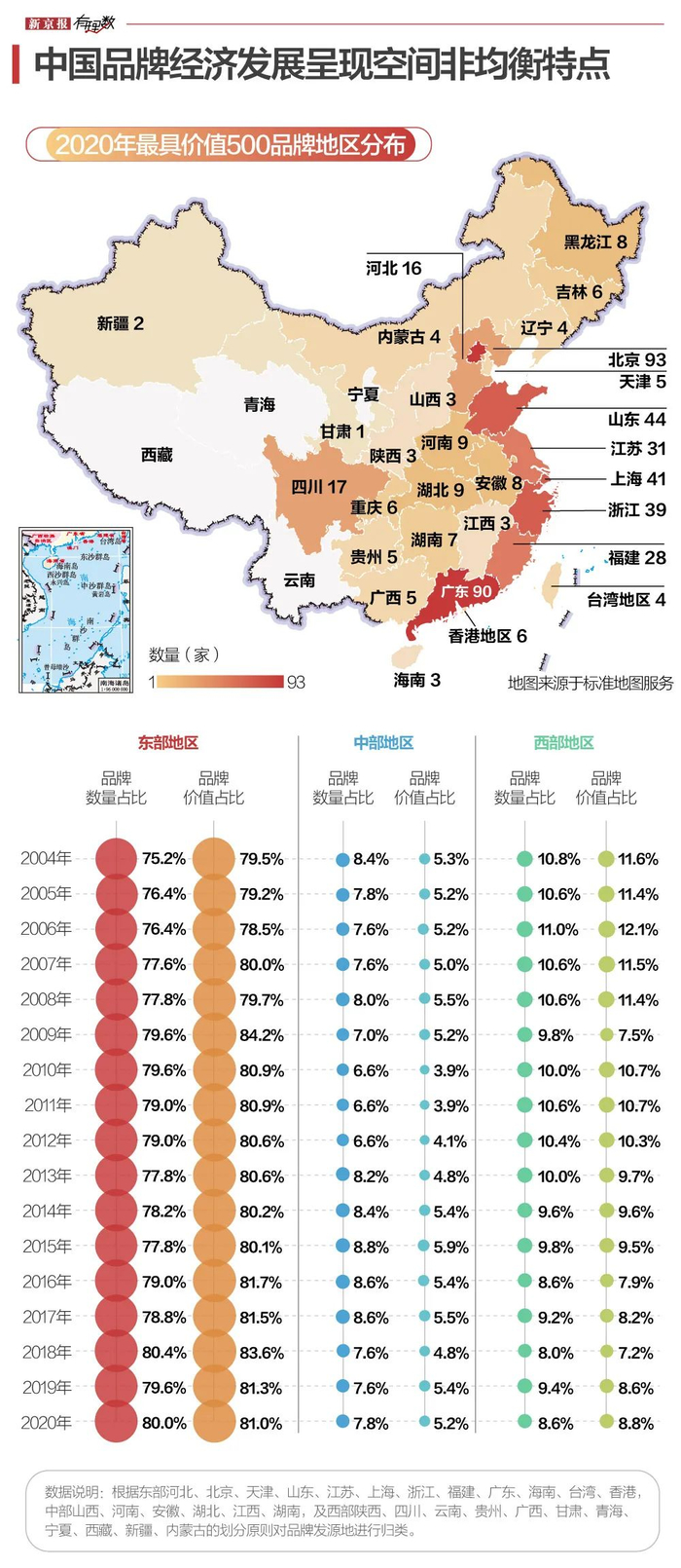 ②从品牌价值的演变趋势看,在2004年—2020年期间,不管是品牌数量还是品牌价值占比,除东部地区呈上升趋势外,中部和西部地区均呈下降态势。由此可见,品牌价值和品牌数量更多地向东部地区集聚。