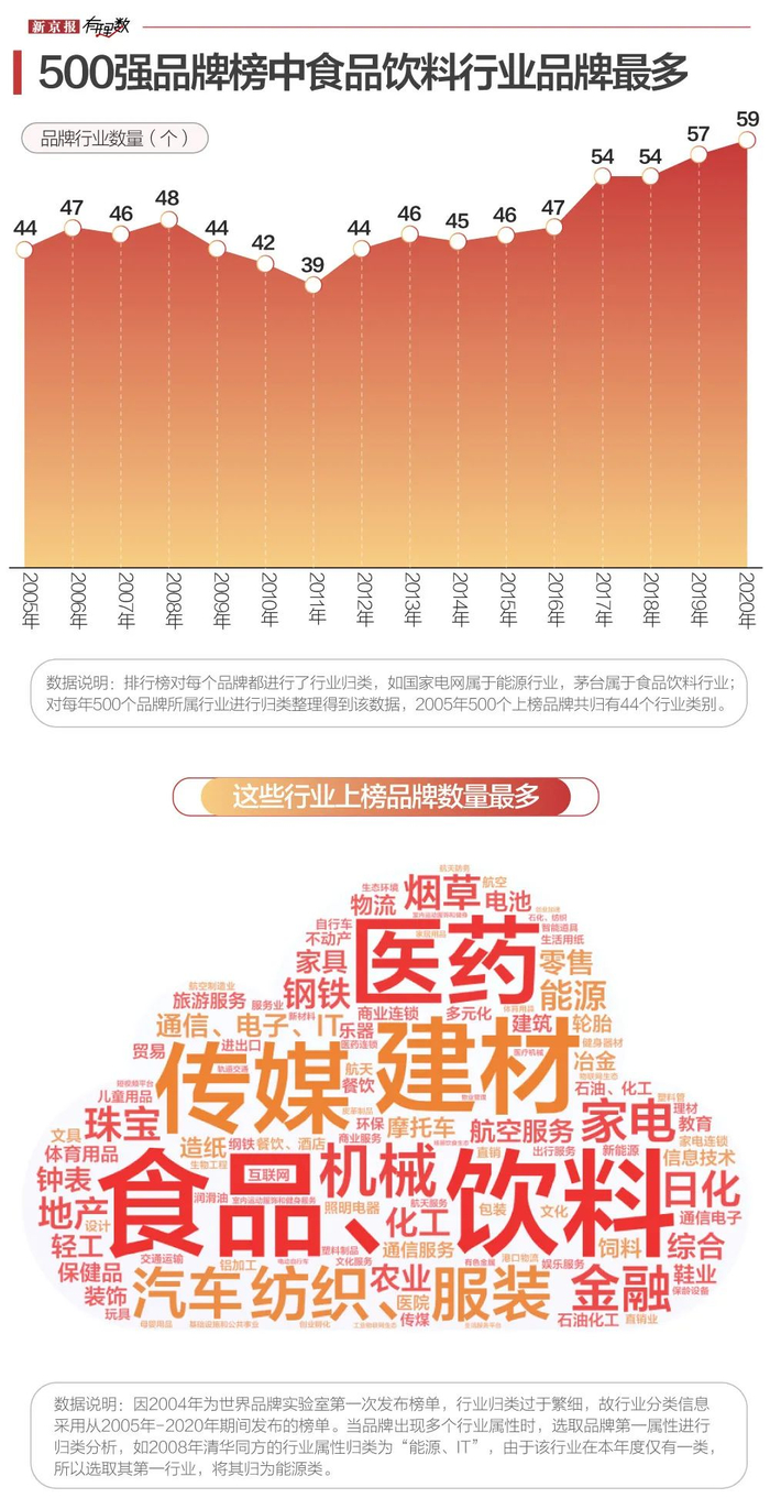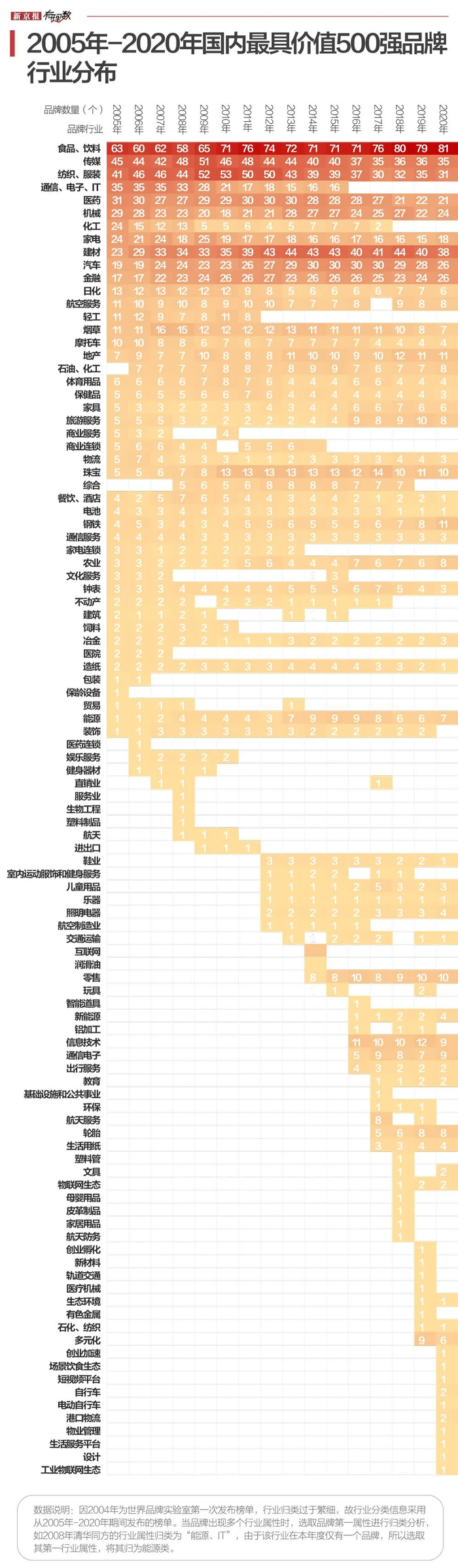 在成为制造大国后的一段时间内,我国500强的品牌都集中在食品饮料、传媒、机械、化工等传统行业。品牌的行业相对单一,且多以国企为主。