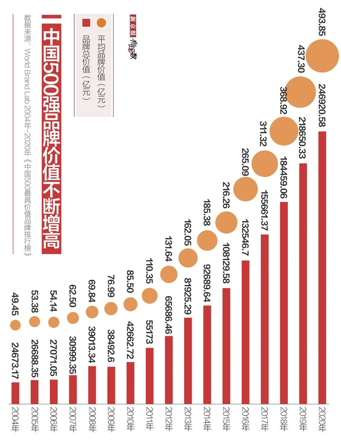 在世界品牌实验室连续发布的《中国500最具价值品牌》中也呈现出同样特点,品牌价值不断提升,2020年500强品牌总价值相比10年前翻了5倍,品牌平均价值是2004年第一次发布时的10倍。