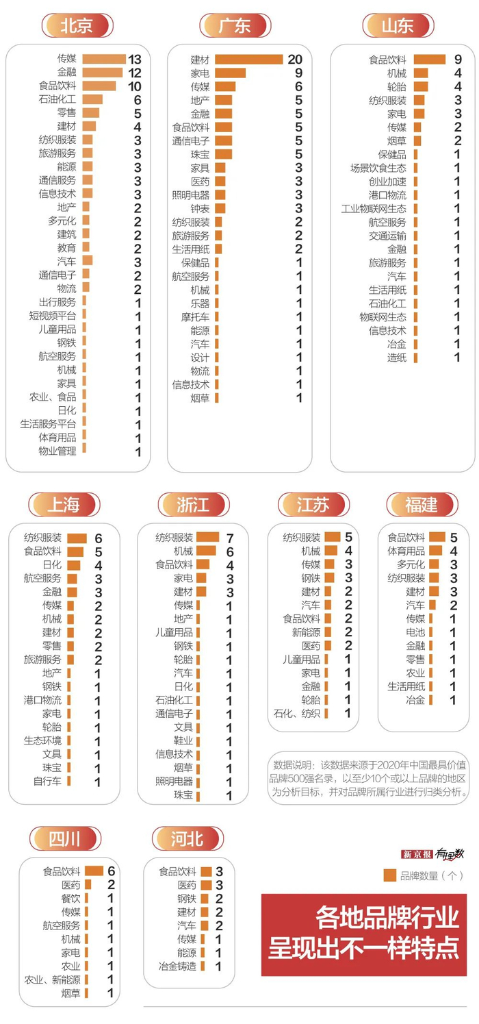 北京经济发达,也是国家政治中心,传媒品牌、金融品牌的数量远超过其他地区,同时品牌所属行业也呈现出多样化特点,2020年共有31个行业的93个品牌进500强。