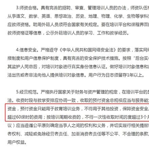 但,2019年7月份,教育部等六部门发布的《关于规范校外线上培训的实施意见》(以下简称《意见》)规定,面向中小学生线上培训,按课时收费的,每科不得一次性收取超过60课时的费用;按培训周期收费的,不得一次性收取时间跨度超过3个月的费用。