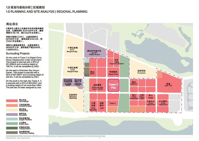超级总部基地空间结构为“一心双核,十字生境”,将山脉水景与充满活力的城市融为一体,C塔项目即位于“超级十字”纵横交汇处,是片区“深湾都市核心”3个超高层地标之一,未来将与A塔与B塔共同构建深超总天际线形象。项目占地面积约3.6万㎡,总建筑面积达50万㎡,其中地上计容面积44万㎡,规划双塔布局,建筑高度约395米,定位为集办公、商业、酒店、文化、交通市政、公共服务等功能于一体的企业总部、国际组织和机构服务平台。项目地下交汇多条城市及城际轨道线路,与地面建筑及交通设施共同形成片区双塔超高层地标TOD综合体,为片区提供多方位的公共配套服务。