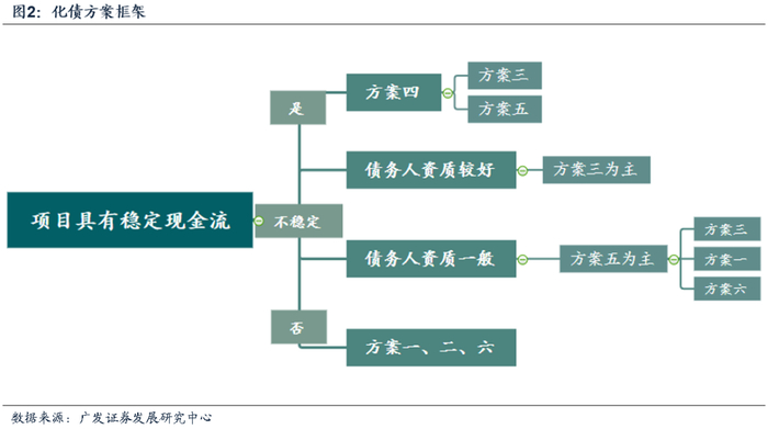 理解了这一点后,我们发现方案四理论上应是所有其他方案的初始步骤。能够转化为企业经营性债务的,将通过方案三(企业收入偿还,适用于状况较好的企业)或方案五(金融机构协助展期等,适用于短期内债务压力较大的企业)或方案六(破产重整清算,适用于严重资不抵债的企业)化解;不能转化为企业经营性债务的,大概率将通过方案一(财政资金偿还,适用于公益性项目)化解。