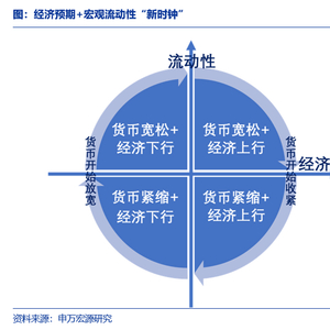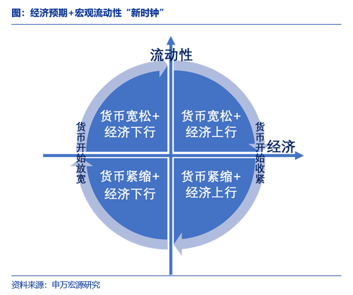 邓虎所在的申万金工团队搭了一个简单的模型,认为新的投资时钟是由新的两根针组成的,经济是没有变的,另外一根针要把通胀换成宏观流动性。
