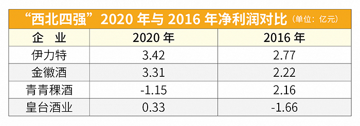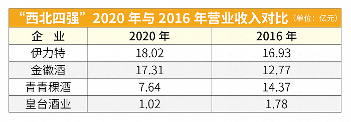 2016年,伊力特、金徽酒的营收在“西北四强”中合计占比64.77%,净利润合计占比90.9%(皇台亏损);