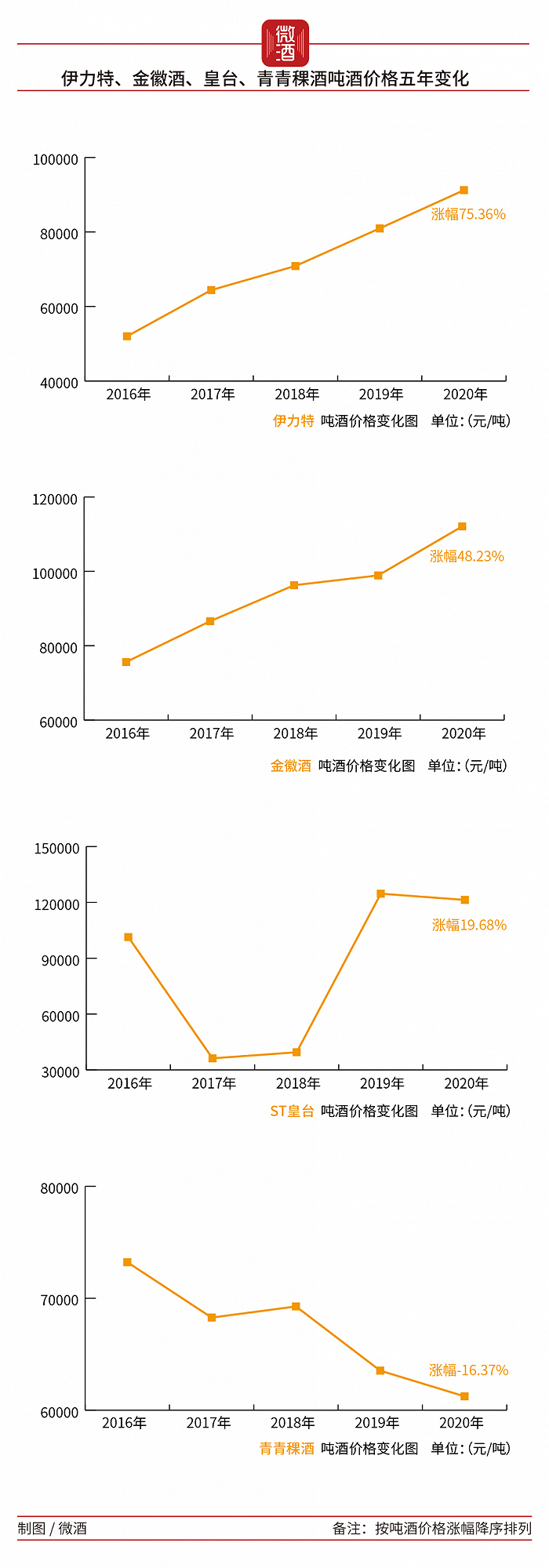 产品升级方面,伊力特的吨酒价格从2016年的5.2万元上涨至2020年的9.12万元;金徽酒的吨酒价格从2016年的7.56万元上涨至2020年的11.21万元。
